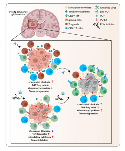 胶质母细胞瘤(GBM)是一种致命的原发性脑癌,在过去的十年中,免疫检查点阻断(ICBs)彻底改变了癌症治疗,但它们对GBM的临床疗效甚微。研究发现,在ICBs耐受的GBM患者中,PTEN基因突变显著富集。PTEN缺陷会激活磷脂酰肌醇3 - 激酶(PI3K)-AKT通路,形成免疫抑制微环境。因此,在PTEN缺陷的GBM患者中,克服ICBs的耐药性仍然是一个临床挑战。近年,溶瘤病毒(OV)在癌症治疗中被认为是有潜力的。PTEN缺陷的GBM有可能成为OV治疗的一个有希望的靶点。