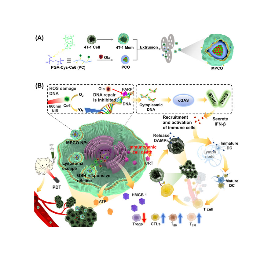 基于此,研发团队开发了多功能仿生纳米颗粒4T1Mem@PGA-Ce6/Ola (MPCO),共同递送具有阻止DNA修复功能的光敏剂Chlorin e6 (Ce6)和Olaparib (Ola)。由于被肿瘤细胞膜包裹,该方法表现出高效的肿瘤靶向和细胞内化特性,Ce6和Ola在激光照射下产生了显著的协同抗肿瘤作用。