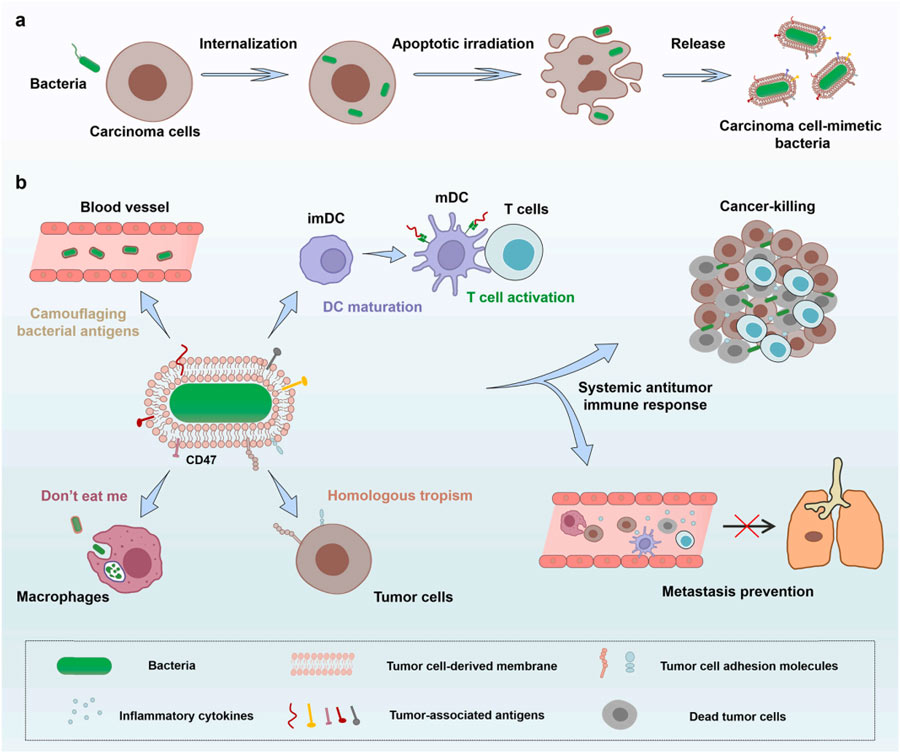 尽管细菌疗法提供了一种独特的治疗选择,但由于细菌的高致病性和强免疫原性,临床上会不可避免产生副作用,还可能会被吞噬细胞快速清除。同时,给药后肿瘤特异性积累有限,治疗效果不佳,治疗方式单一,这在很大程度上限制了细菌疗法的进一步应用。