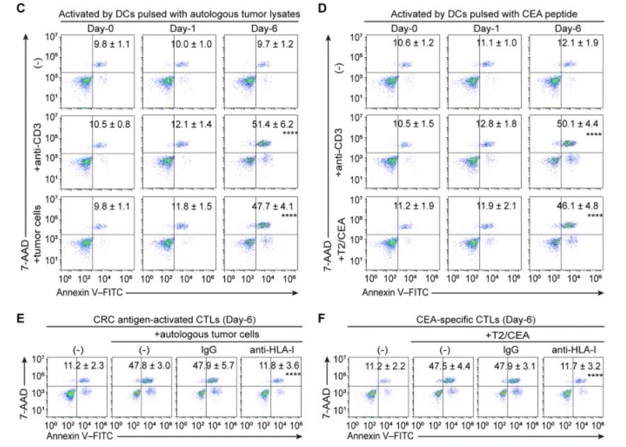 C Apoptosis of CTLs induced by anti-CD3 or autologous tumor cells (n = 4 samples; ****p ≤ 0.0001 compared with untreated day-6 CTLs by one-way ANOVA). D Apoptosis of CTLs induced by anti-CD3 or CEA-loaded T2 cells (T2/CEA) (n = 4 samples; ****p ≤ 0.0001 compared with untreated day-6 CTLs by one-way ANOVA). E Apoptosis of the CRC antigen-activated CTLs induced by autologous tumor cells preincubated with anti-HLA-I or IgG (n = 4 samples; ****p ≤ 0.0001 compared with IgG by one-way ANOVA). F Apoptosis of the CEA-specific CTLs induced by CEA-loaded T2 cells (T2/CEA) preincubated with anti-HLA-I or IgG (n = 4 samples; ****p ≤ 0.0001 compared with IgG by one-way ANOVA)