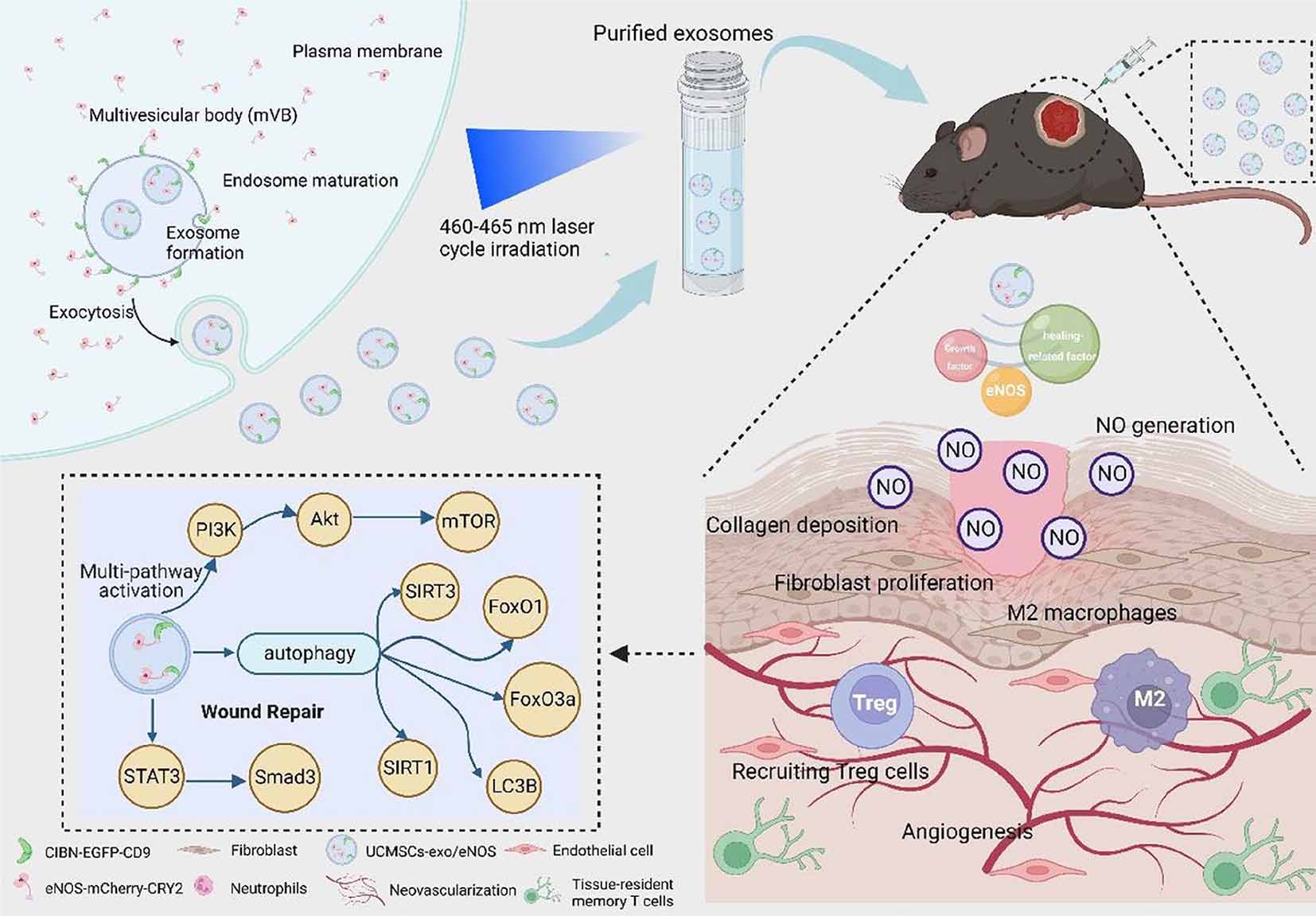 研究发现,UCMSC衍生的外泌体能够通过其信号传导和细胞因子释放来调节DC细胞分化、抗原呈递、Th17细胞分化以及免疫调节因子的表达,从而重塑伤口的免疫微环境,促进组织修复。此外,光遗传学工程化的UCMSC衍生的外泌体在裸鼠皮肤创伤模型中表现出更好的治疗效果,这表明光遗传学工程化的UCMSC衍生的外泌体有望成为治疗糖尿病伤口和组织修复的新型治疗策略。