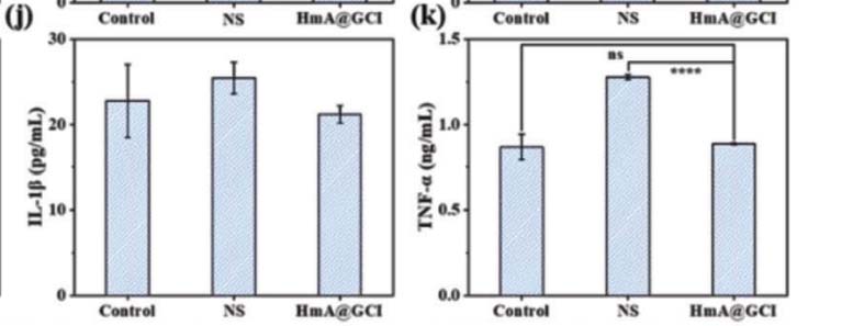 注射NS和HmA@GCI后健康小鼠和糖尿病小鼠血清中白细胞介素-1β(IL-1β)、肿瘤坏死因子-α(TNF-α)的浓度
