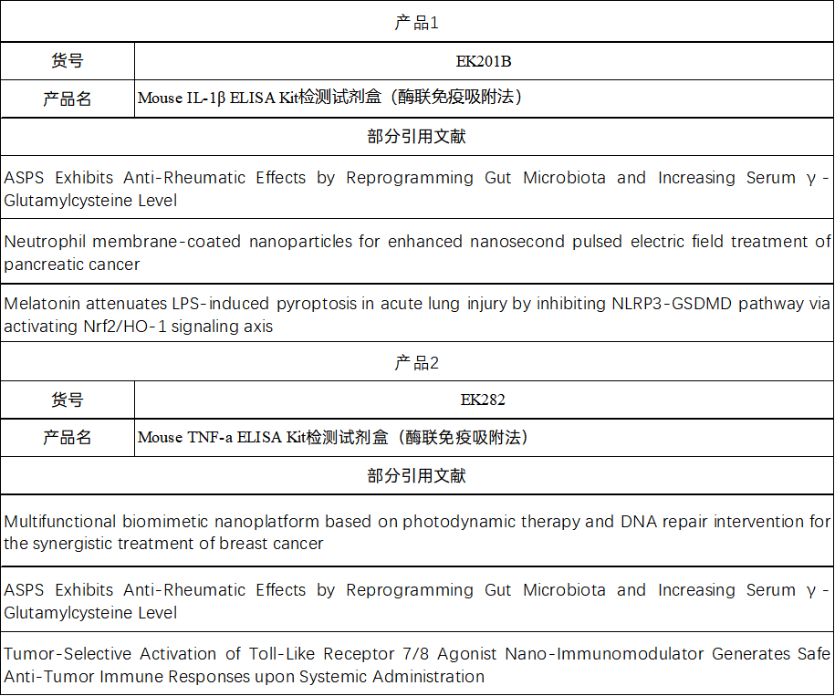 这篇论文所使用的联科Mouse IL-1β ELISA和Mouse TNF-α ELISA检测试剂盒,广泛应用于科研研究,基础医学,临床研究等领域,如细胞药物研究、免疫治疗领域、干细胞应用领域、肿瘤治疗及靶点药物研究、炎症或病毒感染治疗及预后等领域客户。