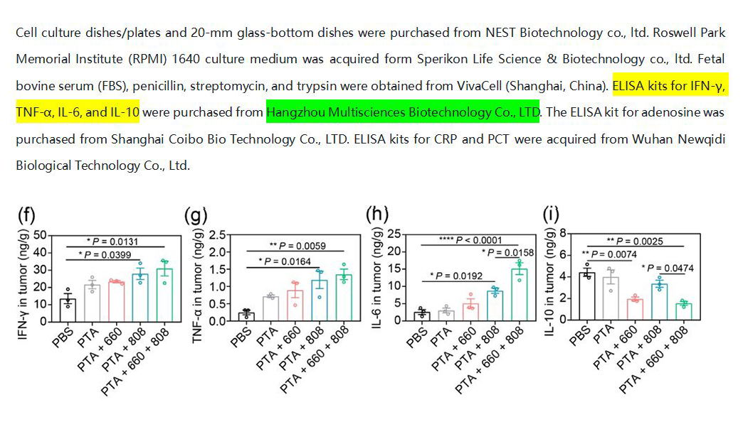 2024年4月26日,武汉大学一研究团队在Materials Today(IF=24.2)在线发表题为“Polydopamine-armed microalgal oxygenerator targeting the hypoxia-adenosine axis to boost cancer photothermal immunotherapy”的研究论文,此论文使用了联科生物Mouse IFN-γ ELISA Kit(货号:EK280),Mouse TNF-α ELISA Kit(货号:EK282),Mouse IL-6 ELISA Kit(货号:EK206)和Mouse IL-10 ELISA Kit(货号:EK210)4种检测试剂盒。