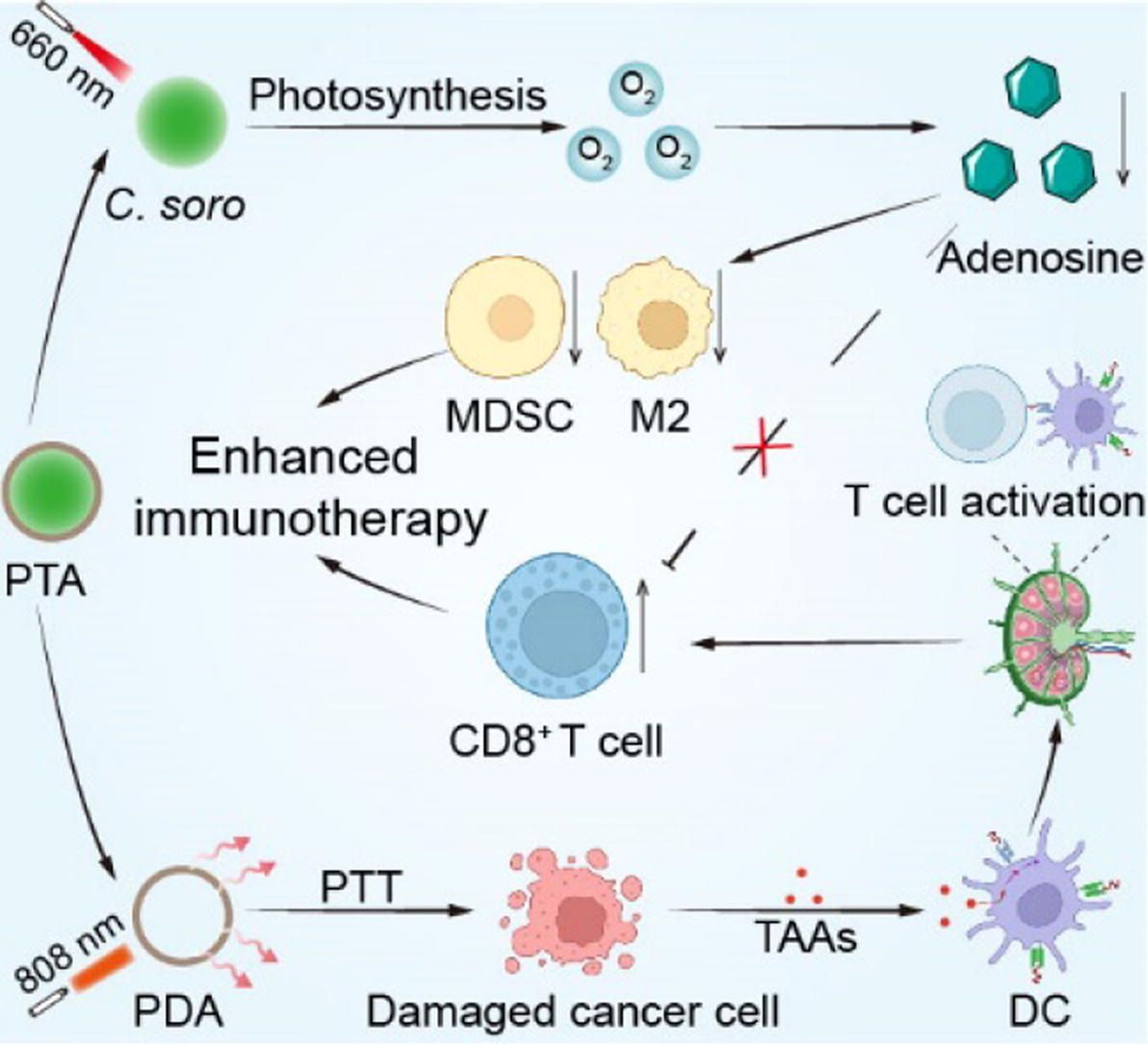 研究团队开发了一种光热微藻系统(PTA),以解决肿瘤微环境中缺氧导致的免疫抑制问题: