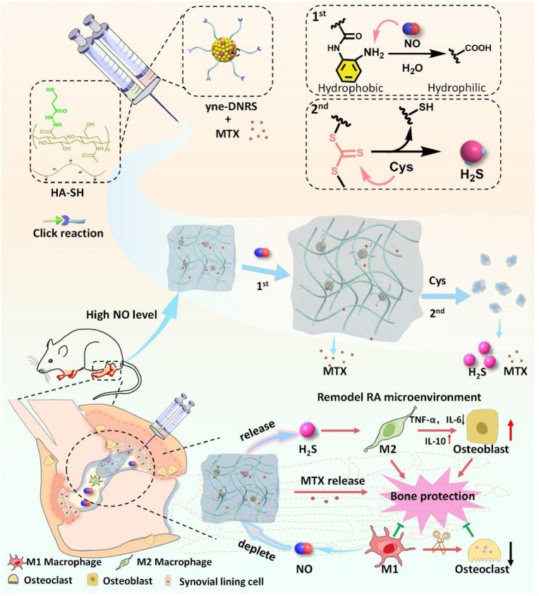 Schematic illustration of the fabrication of self-healing injectable hydrogel and the mechanism of bone protection by regulating the microenvironment of RA. DNRS gel depletes excessive NO and releases H2S in the presence of cysteine, and sustained release MTX.