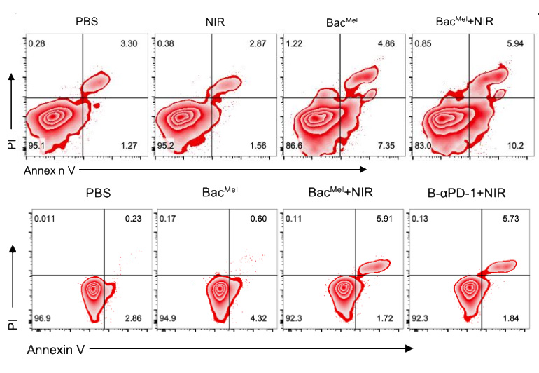 首先,研究团队将基因操作和界面聚合结合,对大肠杆菌进行了双重修饰,使其同时携带光热黑色素和免疫检查点抑制剂αPD-1,并证明了该大肠杆菌(命名为BacMel)的时空可控分布所带来的光热效应可以有效地激活T细胞免疫反应。之后,证明了BacMel在皮下和原位乳腺肿瘤模型中,能够显著抑制肿瘤生长,大大延长宿主生存期,显示出良好的治疗价值。