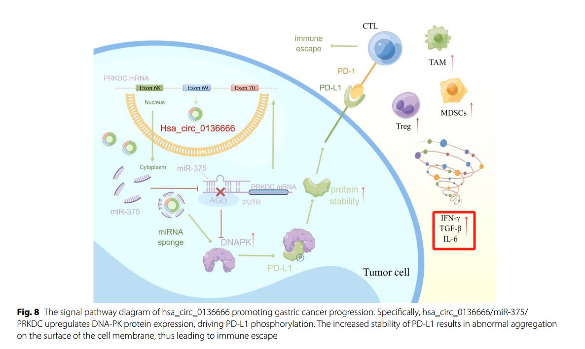 该研究发现hsa_circ_0136666通过调节miR-375/PRKDC轴和PD-L1磷酸化刺激胃癌进展和肿瘤免疫逃逸。