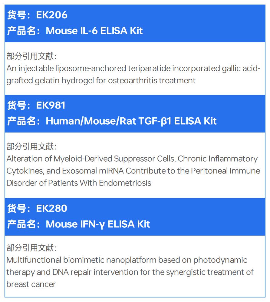 2023年12月13日,中国药科大学邢莹莹副教授、郑禄枫副教授、唐昕莹副研究员研究团队在Molecular Cancer(IF=37.3)在线发表题为“Hsa_circ_0136666 stimulates gastric cancer progression and tumor immune escape by regulating the miR-375/PRKDC Axis and PD-L1 phosphorylation”的研究论文,此论文使用了联科生物Mouse IL-6 ELISA Kit(货号:EK206),Human/Mouse/Rat TGF-β1 ELISA Kit(货号:EK981)和Mouse IFN-γ ELISA Kit(货号:EK280)3种检测试剂盒。
