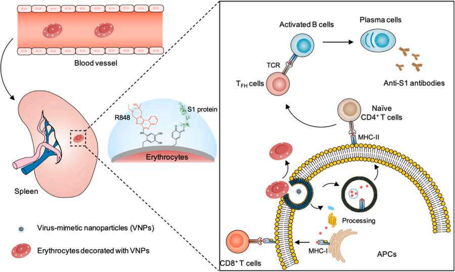 利用仿病毒纳米颗粒(VNPs)提供病毒抗原的疫苗已显示出良好的安全性和有效性。纳米颗粒可以被设计成针对特定的组织和细胞类型,以改善靶向积累,并与分子佐剂一起传递病毒抗原,以增强保护性的体液和细胞免疫反应。纳米颗粒载体还可以提高其装载货物的稳定性。然而,纳米颗粒疫苗通过扩散[14]被动穿透生物屏障和组织,大多数纳米颗粒在进入引流淋巴结前被单核吞噬细胞系统迅速清除或被组织驻留抗原提呈细胞(APCs)捕获,降低了抗原提呈淋巴细胞的效率。因此,需要专门有效地将VNPs输送到脾脏等次级淋巴器官的方法。