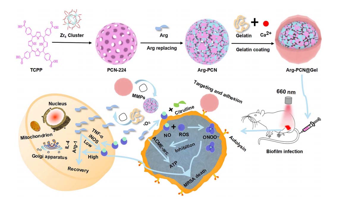 该研究以PCN-224为光动力平台,开发一种靶向耐甲氧西林金黄色葡萄球菌生物被膜的精氨酸驱动的光动力与营养免疫协同治疗的复合纳米系统,并系统研究了该复合纳米系统对生物被膜的杀伤活性及其作用机制。