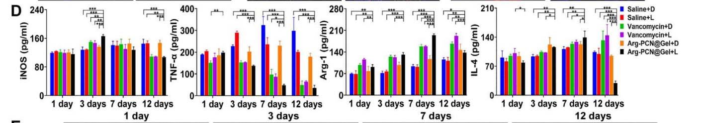 图2营养免疫疗法。(D)感染部位Arg-1、IL-4、iNOS和TNF-α的表达。将感染Balb/c小鼠分为6组(标签A~ F,每组12只),按上述方法进行单剂量治疗。治疗1、3、7、12 d后,每组处死3只小鼠,收集感染组织检测免疫因子(iNOS、Arg-1、TNF-α、IL-1β、IL-6、IL-4、IL-10)。