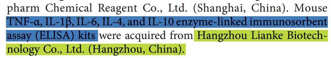 该篇论文共使用联科生物5种ELISA检测试剂盒来检测不同处理组小鼠样本中的免疫因子,分别是Mouse TNF-α、Mouse IL-1β、Mouse IL-6、Mouse IL-4、Mouse IL-10 ELISA Kit酶联检测试剂盒。此类产品广泛应用于科研研究,基础医学,临床研究等领域,如细胞药物研究、免疫治疗领域、干细胞应用领域、肿瘤治疗及靶点药物研究、炎症或病毒感染治疗及预后等领域的研究者。