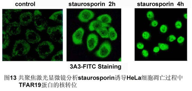 TFAR19(PDCD5)是由本研究室在国际上首先报导的一个拥有自己知识产权的人类新基因,前期的功能研究表明,它是促进细胞凋亡的增强剂。利用荧光素(FITC)标记的TFAR19单克隆抗体为探针,对细胞凋亡过程中TFAR19蛋白的表达水平及定位研究发现,凋亡早期TFAR19表达水平增高并出现快速核转位现象,伴随着细胞核形态学的变化,持续较长时间,在凋亡小体中仍然可见。同时我们发现,凋亡早期TFAR19蛋白的核转位早于磷脂酰丝氨酸(PS)外翻和细胞核DNA的片段化,提示TFAR19蛋白的核转位是细胞凋亡更早期发生的事件之一。进一步的研究证明,凋亡早期TFAR19的核转位具有普遍意义,不同细胞凋亡早期均出现TFAR19高表达和核转位。这为研究细胞凋亡早期所发生的事件,提供了一种新的技术和指标。