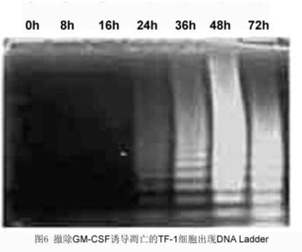 细胞凋亡时主要的生化特征是其染色质发生浓缩, 染色质DNA在核小体单位之间的连接处断裂, 形成50~300 kbp长的DNA大片段, 或180~200 bp整数倍的寡核苷酸片段, 在凝胶电泳上表现为梯形电泳图谱(DNA ladder)。细胞经处理后,采用常规方法分离提纯DNA,进行琼脂糖凝胶和溴化乙啶染色,在凋亡细胞群中可观察到典型的DNA ladder。如果细胞量很少,还可在分离提纯DNA后,用32P-ATP和脱氧核糖核苷酸末端转移酶(TdT)使DNA标记,然后进行电泳和放射自显影,观察凋亡细胞中DNA ladder的形成。