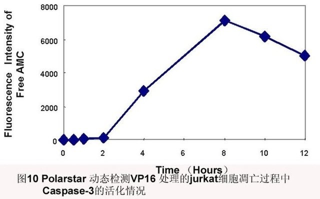 方法:收获细胞正常或凋亡细胞PBS洗涤制备细胞裂解液,加Ac-DEVD-AMC(caspase-3四肽荧光底物)37 °C反应1 h荧光分光光度计(Polarstar)分析荧光强度(激发光波长380 nm,发射光波长为430-460 nm)。