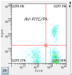 其次补偿调节样本必须可染出一群强阳性(或一群阳性和一群阴性),以比较它们之间的平均荧光强度,这样补偿调节方可准确。故本例中我们使用凋亡阳性质控细胞作为样本。