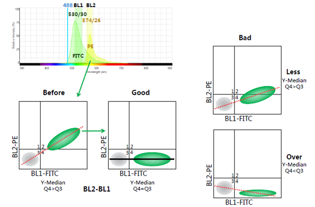 光谱重叠严重的荧光素同时检测会导致荧光溢漏,需调节补偿。