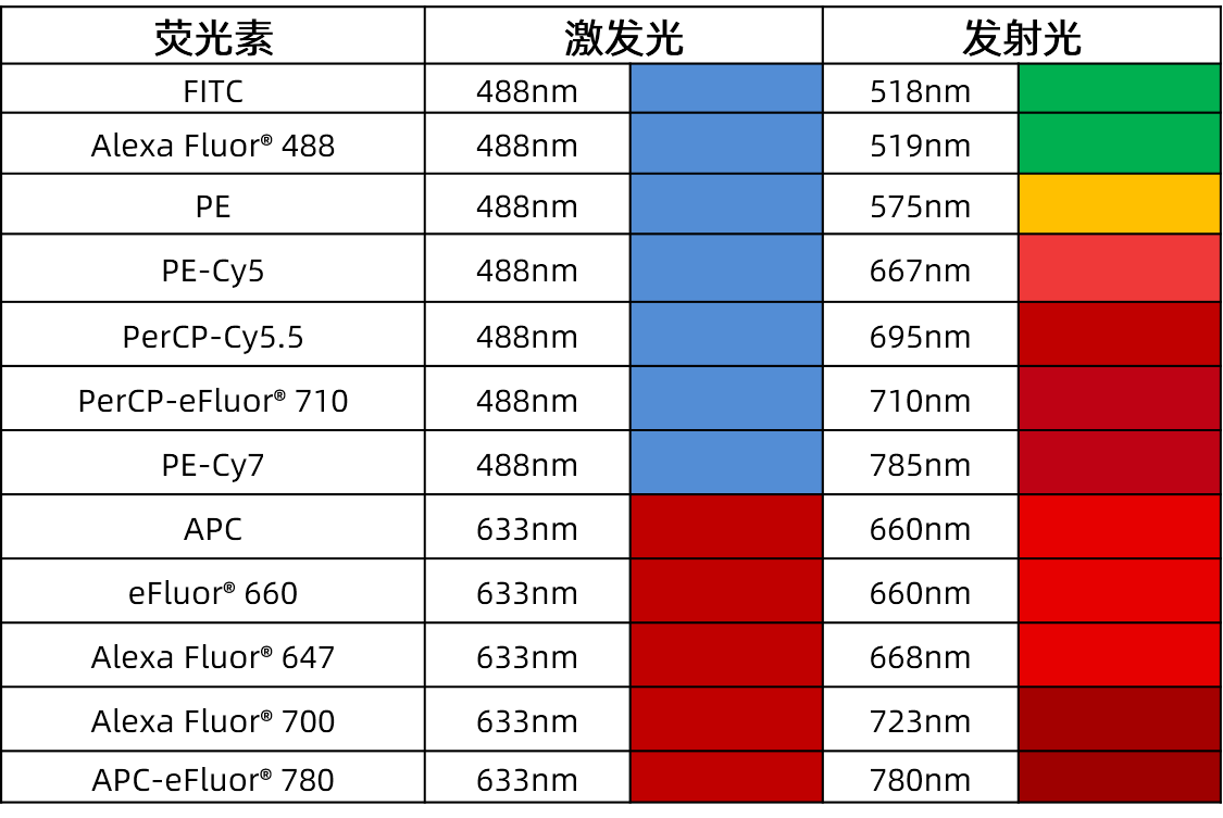 仪器需满足激光管可激发相应的荧光素且可同时检测所需的荧光。附常见荧光素的激发波长和发射波长: