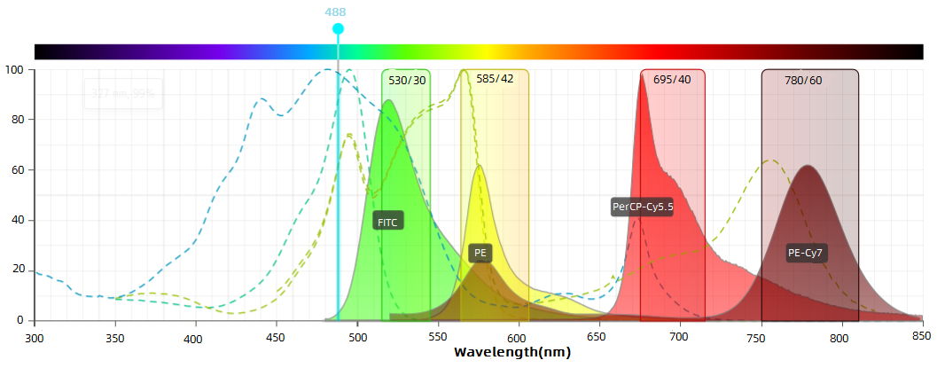 - PerCP-Cy5.5复合染料,最大发射波长为695 nm。与PerCP相反,PerCP的光量子产率较低,适用于表达水平较高物质的检测,PerCP-Cy5.5光量子产率高,可用于表达水平较低物质的检测。在双激光管仪器上与APC共同检测时,需要做补偿调节,但比PerCP补偿少。