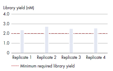 图2. QIAseq cfDNA library Kit. 对起始量为9.35 ng 的cfDNA 的四次独立重复实验显示,针对如此低的核酸输入量,PCR-free 文库也能达到超过2 nM的文库产量。 |