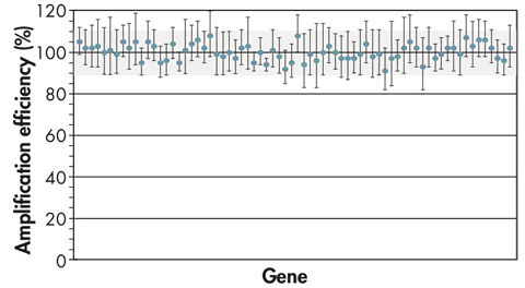 QIAGEN 推出的RT2 Profiler PCR Array是一种高度可靠且灵敏的基因表达谱分析技术,它利用实时定量PCR分析信号转导、生物过程或特异性疾病,来研究通路中聚焦的一组基因。每个PCR Array都包含一条通路聚焦的基因以及5个看家基因。此外,每个阵列还包含一组专利对照,用以监控基因组DNA 污染(GDC)、第一链合成(RTC)和实时定量PCR效率(PPC)。 RT2 Profiler PCR Array上的基因是经过大量相关文献阅读选定,专有的引物设计符合超过10个热力学和序列比对要求。每个RT2 Profiler PCR Array含有89个在实验平台验证过的RT2 qPCR Primer Assays(包括5个看家基因)和一套对照。为实验研究者节省了大量预实验、引物验证、文献选择基因等繁琐的过程,可以直接明了的了解不同课题研究中某信号通路或疾病中关键基因的表达谱。 RT2 Profiler PCR Arrays进行的基因表达分析具有real-time PCR的灵敏度和微阵列的多基因检测能力。这种整合使RT2 Profiler PCR Array具有高特异性和扩增效率,可获得准确的SYBR® Green real-time PCR结果。PCR芯片在任何研究实验室都易于使用。 RT2 Profiler PCR Arrays具有足够高的敏感度,可使用从常规样本(0.1–5 µg RNA)、FFPE样本和小样本(1–100 ng RNA)制备的RNA。