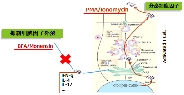静息状态 (即未受任何刺激,如人的正常生理状态)下,Th细胞分泌IFN-γ、IL-4 和 IL-17A 等细胞因子的含量极少,无法被检测到。而当 Th 细胞受到刺激剂刺激,细胞因子表达量会有显著提高。实验中检测的Th细胞实际上是检测Th细胞对刺激素刺激的反应能力。同时,细胞内合成的细胞因子可通过高尔基体运输以可溶性形式分泌至细胞外,而流式细胞仪无法检测细胞外的抗原,所以需要用阻断剂破坏高尔基体以切断细胞因子的转运途径,阻断其分泌。通常选用的刺激素为 Phorbol 12-Myristate 13-Acetate (PMA, 佛波酯)和 Ionomycin (离子霉素),阻断剂为Brefeldin A (BFA, 布雷非德菌素 A)和/或 Monensin (莫能霉素)。