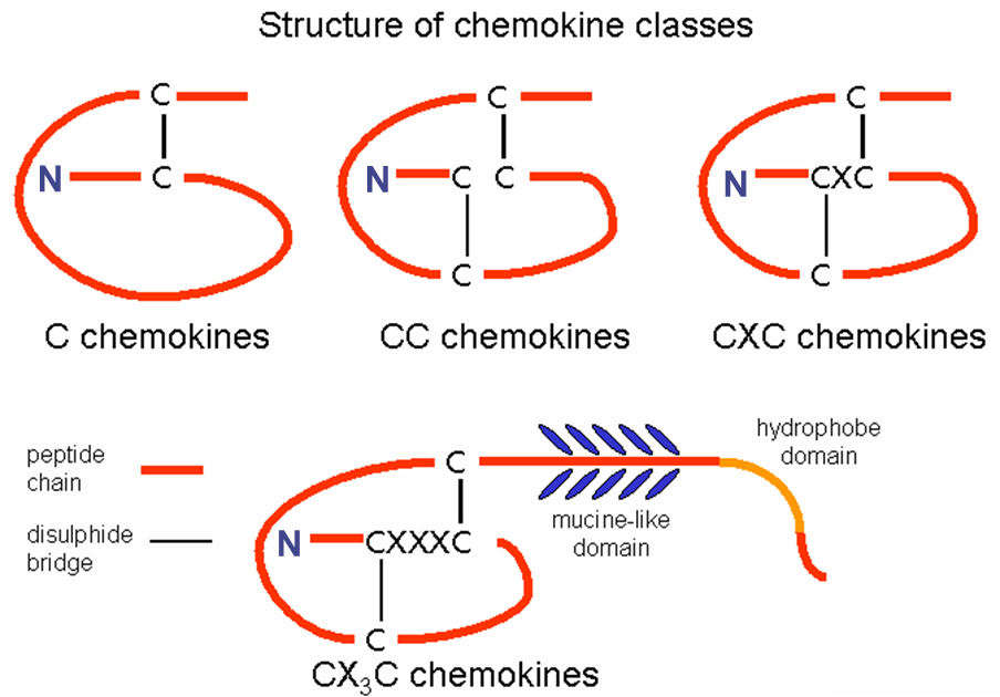 趋化因子是一组具有趋化作用的细胞因子,能吸引免疫细胞到免疫应答局部,参与免疫调节和免疫病理反应。它们多为小于100个氨基酸的小分子多肽,根据结构可主要分为4个趋化因子亚家族:Cys-X-Cys(CXC)、Cys-Cys(CC)、Cys(C)、Cys-X3-Cys(CX3C) 亚家族(如下图)。CXC家族成员多数基因定位于第4对染色体,包括IL-8、IP-10(IFN inducible protein-10)、MGSA等,CC家族成员多数基因定位于第17对染色体,包括MIP-1α, β(macrophage inflammatory protein)、 MCP-1(macrophage chemotactic protein)、RANTES (regulated upon activation normal T expressed and secreted)等。C家族只有一个成员Lymphotactin,基因定位于1号染色体。CX3C家族也只有一个成员Fractalkine (neurotactin),基因定位于第16对染色体。
