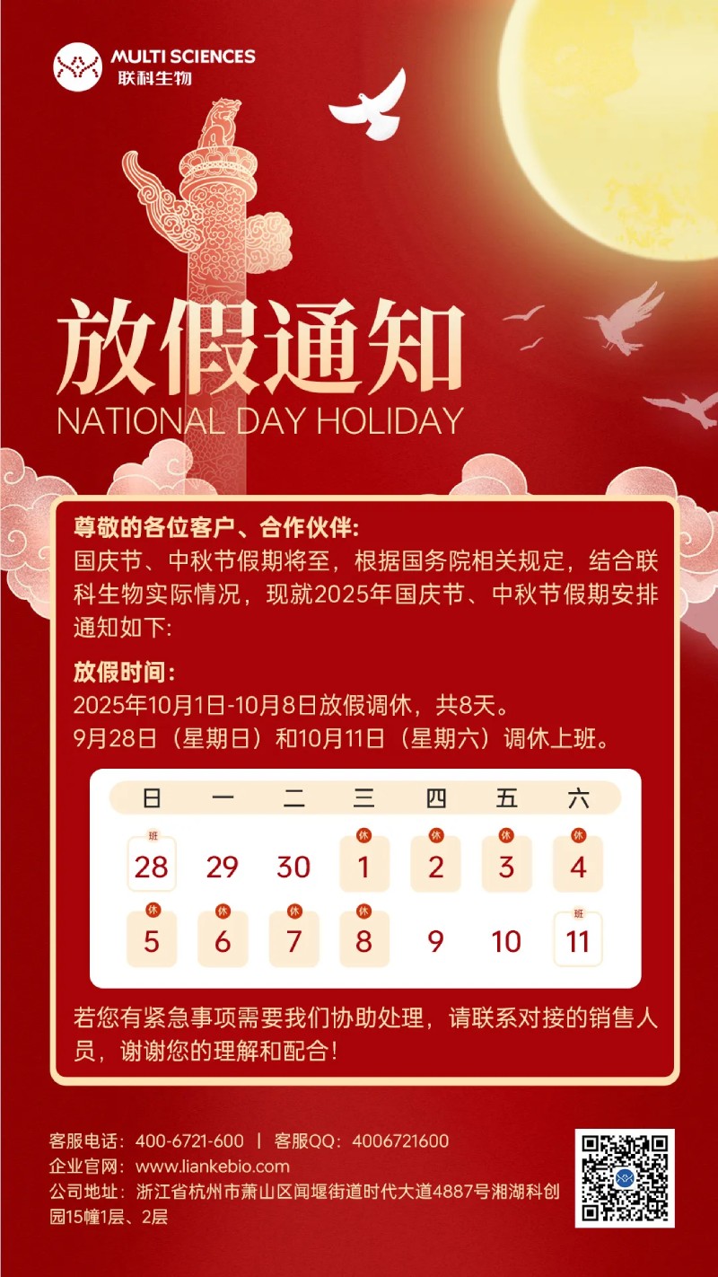 放假通知 Post published:2025-09-30 Post category:新闻动态Post views:718 次访问 Read more articles Previous Post告别重复差慢,拥抱准稳快:联科生物MES系统,为您的实验保驾护航 Next Post喜报!联科生物产品引文数量突破15000篇,科研影响力再创新高 你可能也喜欢 前沿速递 | 结直肠癌抑制药物的开发新选择 2022-01-12 Human Neuropilin-2检测试剂盒Elisa试剂推荐 2016-03-15 探针标记的二抗偶联物产生的交叉吸附类型 2007-08-01 联科生物实验服务全方位来袭!5折代测 限时促销 2017-04-28 微生物影响代谢发展的时机 2014-09-20 暑期价到,提前矩惠——分子产品大促来袭 2018-06-19 邀请函 | 中国细胞生物学学会全国学术大会,我们期待与您鹭岛相聚! 2022-08-09 流式金秋,联科相聚 2019-11-25