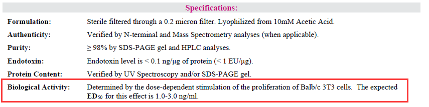 要回答这个问题,我们首先要明确ED50的概念。细胞因子产品的说明书中均会给出ED50的值,对于PeproTech的产品,在说明书的 "Biological Activity"处会注明该细胞因子的生物活性检测方法以及所得的ED50的值。