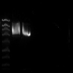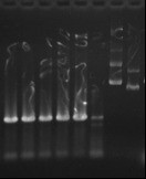 | 图一:制胶时带入了其它杂质,形成了障碍物,使得DNA条带电泳时受到阻碍无法继续电泳,从而形成扭曲带 |
