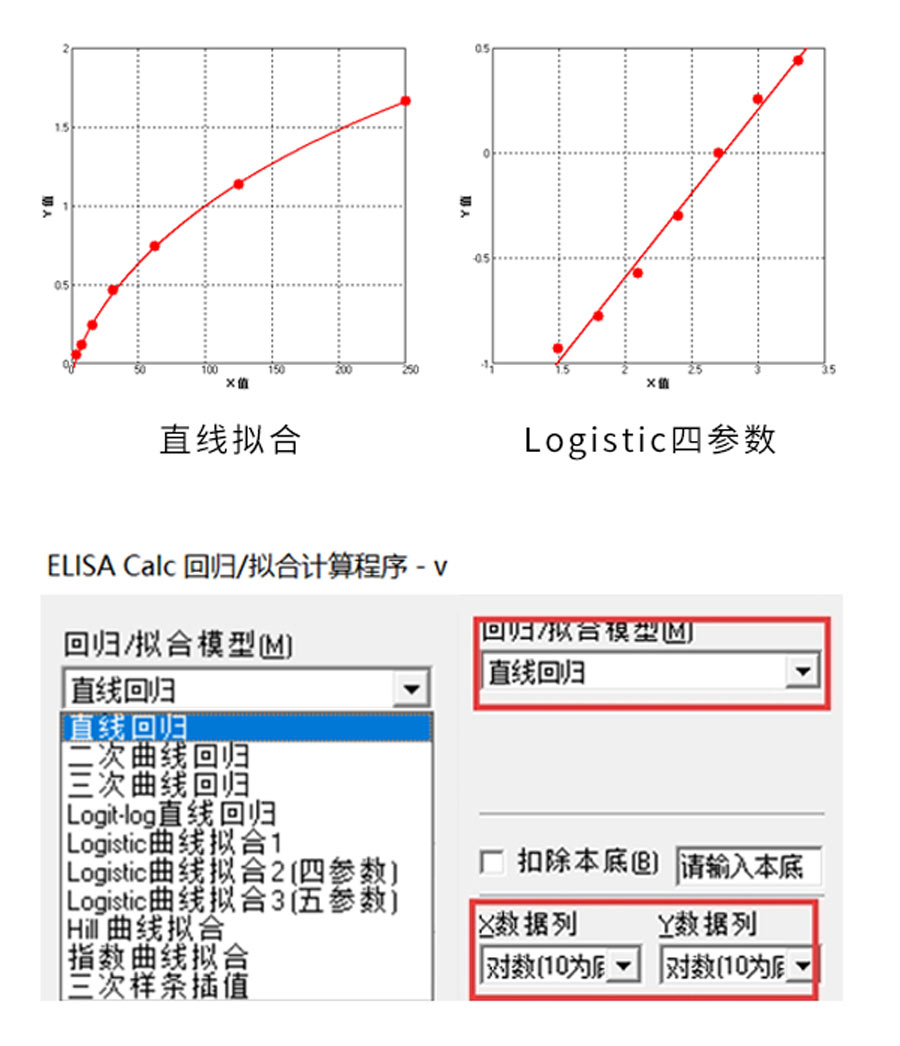 注:曲线拟合方法虽多,要根据不同类型ELISA本身的特点,选择最适合的曲线拟合模型,才能得到最合理的实验结果。一般情况下,需要综合考虑标准曲线的趋势走向以及R2值的大小以及样本落值情况。