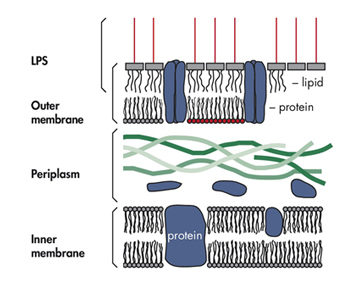 内毒素,即脂多糖或LPS,是革兰氏阴性菌(如大肠杆菌)细胞膜的组成部分。细菌外膜的外层脂质部分是完全由内毒素分子所构成的。单个大肠杆菌细胞约包含两百万个LPS分子,每个LPS分子由疏水的脂质A(lipid A)部分、复杂的糖类残基阵列部分及负电性的磷酸基团所组成。因此,每个内毒素分子都具有疏水域、亲水域和电荷域,这使它在与其他分子相互作用时具有其独特的自身性质。细菌在其活性生长期向其周围微环境中散布少量的内毒素,在死亡时则释放大量内毒素。