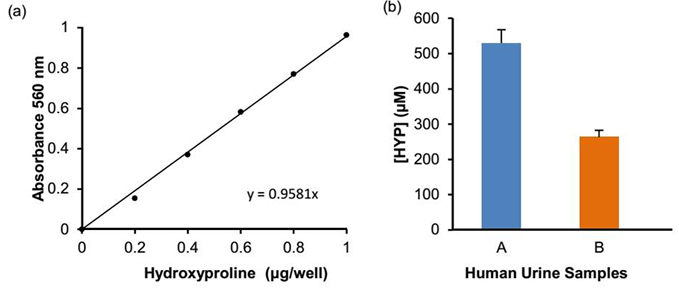 (a)羟脯氨酸标准曲线(b) 根据试剂盒protocol测定人类尿液样本中羟脯氨酸浓度。样本A – 剧烈运动后禁食12小时;样本B –样本A 7小时后正常饮食(900卡路里)。