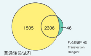 图3 转录组芯片分析实验结果显示普通转染试剂相比较,FuGENE HD显著降低了转染试剂自身造成的基因表达变化的基因数量。遵照各自的操作手册,使用FuGENE HD和普通转染试剂分别将含有或不含有的SEAP表达序列的质粒转染到MCF-7和HeLa 细胞中。转染后,使用Affymetrix Human Whole Genome U133 Plus 2.0 microarray分离值制备RNA;与对照组进行比较后,研究基因表达上调和下调的基因数量。重叠区域的数字表示两种转染试剂都会影响的表达的基因数量。结果:使用两种不同的细胞系的独立实验结果表明,与普通转染试剂相比较,FuGENE HD转染试剂具有最小的脱靶效应。 |