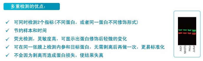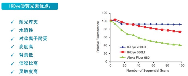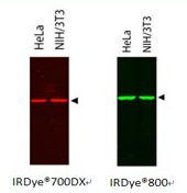 | IRDye®系列荧光素为红外染料,可在LI-COR公司的Odyssey® Infrared Imaging System仪器中进行WB荧光检测,比其它可见光荧光素的背景低,比ECL法更灵敏,可达到pg级。还可用于荧光显微镜观测、电泳迁移位移试验和体内分子成像等实验。 |