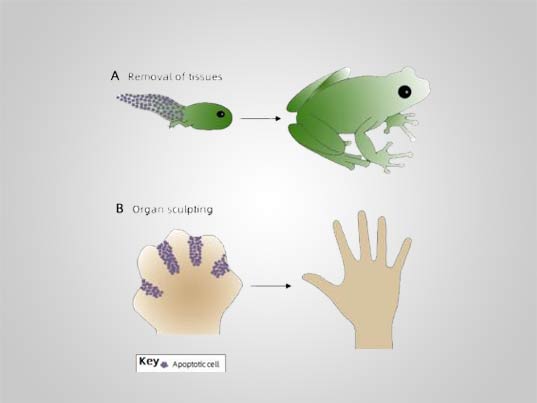 细胞凋亡(apoptosis):属于细胞程序性死亡(Programmed Cell Death,PCD),是由基因控制的细胞自主、有序的死亡,在维持生物体内环境稳定方面发挥着重要作用。蝌蚪发育成青蛙的过程中,尾的消失就是生物学中典型的细胞凋亡现象。