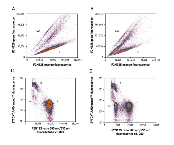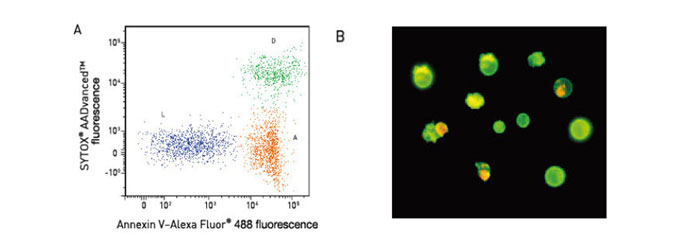 3 紫色膜不对称性比率探针/死细胞凋亡试剂盒 Violet Ratiometric Membrane Asymmetry Probe/Dead Cell Apoptosis Kit (A35137)提供了一种利用紫色激光流式细胞仪简单高效地检测细胞凋亡与细胞死亡的方法(图3)。紫色膜不对称性比率探针可检测凋亡过程中细胞膜的不对称性变化。它用于贴壁细胞和悬浮细胞均可获得极佳的性能,且可与其他凋亡指示剂(如caspase检测和线粒体膜电位改变)相关联。 该染料能产生激发态分子内质子迁移(ESIPT)效应,产生波长为530 nm和585 nm的双发射光谱,可对表面电荷的变化产生双重颜色比率的响应。F2N12S探针与SYTOX? AADvanced? 死细胞染料结合,该染料仅能穿过晚期凋亡细胞或坏死细胞的细胞膜,从而将其与早期凋亡细胞区分开来。 与基于Annexin的分析不同,该分析方法无需特殊的缓冲液或冲洗步骤,而且在对贴壁细胞分析时,它不易出现物理或化学清除步骤中常见的细胞膜损伤,从而可以提供更佳的数据质量。