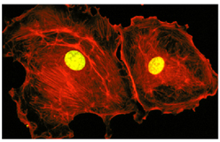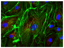 图10牛肺动脉内皮细胞成像图。破膜后的牛肺动脉内皮细胞用SYTOX® Green nucleic acid stain染色细胞核(绿色),BODIPY® TR-X phallacidin染色F-actin(红色)。 |