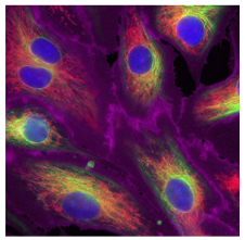 图8 人U2OS活细胞成像图。胞膜经CellMask™ Deep Red plasma membrane stain染色,内质网经ER-Tracker™ Green dye染色,线粒体经MitoTracker®Red CMXRos染色,核酸经NucBlue™ Live Cell Stain染色。标记细胞经Live Cell Imaging Solution重悬后进行激光共聚焦观察。 |