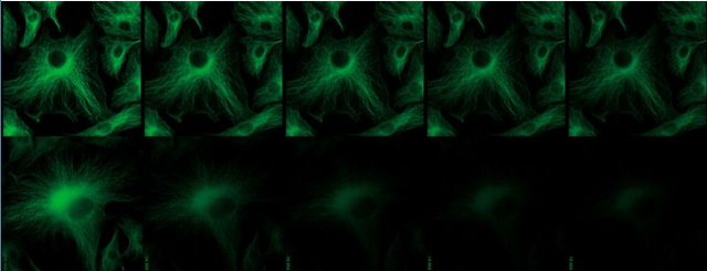 | 上图 经固定的牛肺动脉内皮细胞(BPAEC)标记抗α-tublin抗体和FITC-goat anti-mouse IgG。样本经ProLong Gold antifade reagent (P36930,上排)或PBS(下排)处理。图像为每隔5秒的荧光成像。 |