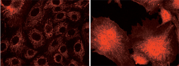 | 上图 Image-iT FX signal enhancer可增强标记特异性和分辨率。固定破膜的牛肺动脉内皮细胞经Image-iT FX signal enhancer处理(左)或不处理(右),随后标记tetramethylrhodamine streptavidin。 |