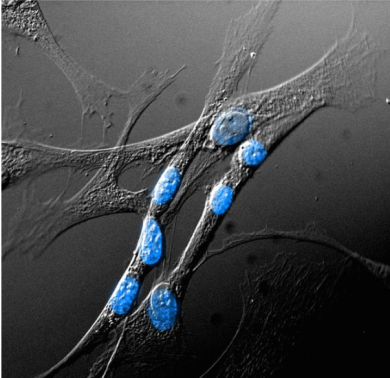 ⇒ 室温保存右图 人皮肤成纤维细胞(HDF)经Image-iT Fixation/Permeabilization Kit固定破膜后,加入2滴/ml的NucBlue? Fixed Cell染料进行染色。