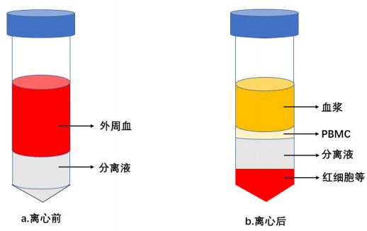 全血样本中不同类型的细胞具有不同的密度,密度梯度离心法即是根据细胞沉降系数的差异,借助淋巴细胞分离液和离心操作分离得到Peripheral Blood Mononuclear Cells(PBMC)。