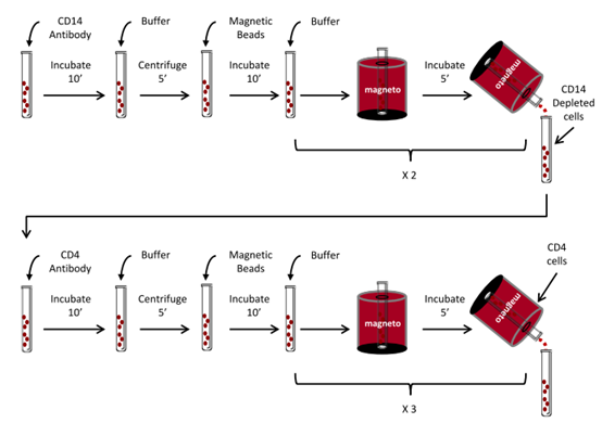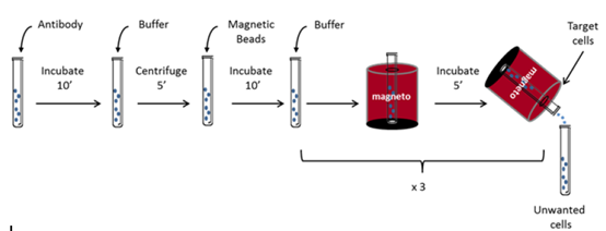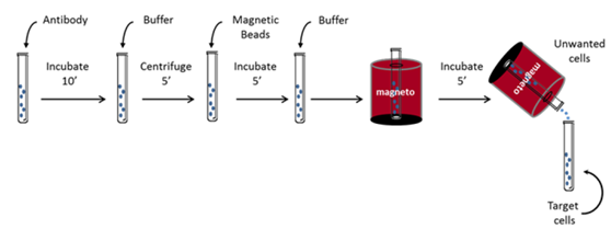 | Magnisort™为无柱分离细胞,更简单,更快速,与传统的柱分离方法相比节省了大量的成本消耗。无柱分离优点: ♦ 快速:无需润洗柱子;无需漫长等待细胞流出 ♦ 简单:无需考虑柱子承载量;无需费神盯着柱子 ♦ 温和:阴选完全没有接触;没有柱子对细胞的挤压损伤 ♦ 便宜:只需要购买一次磁座;不用买昂贵的一次性柱子;分选细胞量大 200 tests = 2x10^9 cells vs. 1x10^9 for MB and SCT ♦ 兼容:与Stem Cell 5ml EasySep magnet通用,如您有该磁体,也可定购eBioscience的磁珠! 目前eBioscience已开发研究出30多种细胞分选产品,包括常用到的人和小鼠T细胞、B细胞、NK细胞及单核-巨噬细胞,一些新产品会陆续推出,期待大家关注,欢迎大家来电咨询! (二)阴选Negative Selection (三)阴选Negative Selection+阳选Positive Selection |