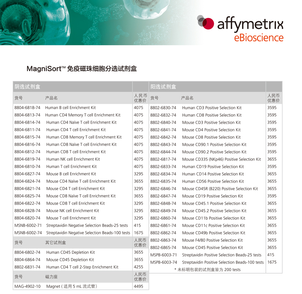 MagniSort免疫磁珠细胞分选产品半价优惠 Post published:2015-08-06 Post category:生物资讯Post views:3208 次访问 https://www.liankebio.com/article-information_promotions-1654.html 作者:eBioscience官网 发布日期:2015-08-06 11:00 Read more articles Previous Post揭开FFPE样本中癌症相关small RNA的神秘面纱 Next Post研发中心重装升级,买Luminex试剂免检测费 你可能也喜欢 PeproTech 高品质趋化因子 (Chemokine) 2017-04-01 丙酸和丁酸可减弱CoCrMo合金颗粒诱导的巨噬细胞焦亡和破骨细胞形成(IF=34.915) 2022-10-25 人ELISA检测试剂盒推荐:AFP甲胎蛋白 2016-01-26 论文分享 | 40.8分!胰腺癌治疗新思路 2024-08-13 联科生物 ELISA高敏家族添新成员啦! 2017-05-10 我国首次完成杜仲基因测序 2018-01-02 MerTK-巨噬细胞的界定标准 2016-08-24 推荐:联科生物分子产品明星产品 2017-08-31