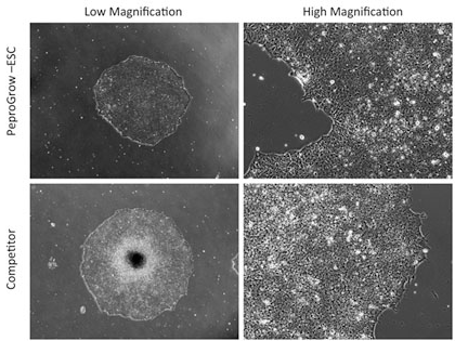 PeproGrow-hESC胚胎干细胞培养基是化学成分明确的完全培养基,不含血清和酚红,专门用于人类胚胎干细胞(hESCs)和诱导多能干细胞(hiPSCs)的无饲养层维持培养和扩增(需以BD MatrigelTM作为表面包被基质)。该培养基可保持hESCs 和hiPSCs的未分化、多能状态(SSEA4+/Oct4+),流式细胞术分析显示自发分化的细胞比例低于15%。该培养基的独特配方中含有FGF2(碱性成纤维细胞生长因子)等生长因子,但不含市场上大多数其他品牌胚胎干细胞培养基中存在的胰岛素。PeproGrow-hESC胚胎干细胞培养基由美国PeproTech公司和美国Rutgers(罗格斯)大学干细胞培训中心合作设计与研发,包含一瓶100ml或500ml基础培养基和一管单独的重组生长因子冻干粉。
