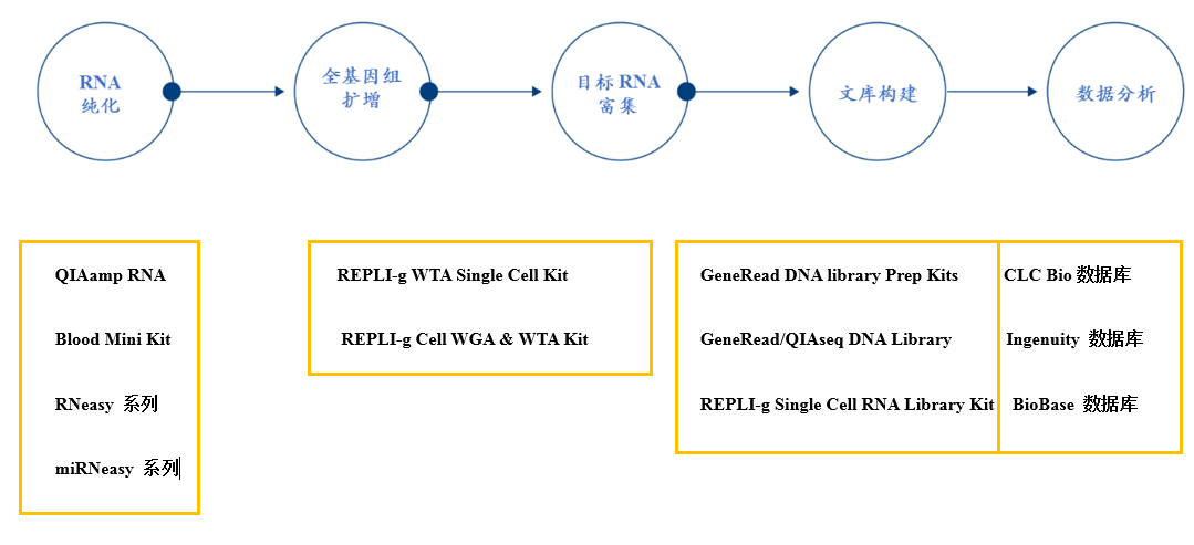 RNA-seq中需要考虑的因素 第一个需要考虑的因素是样本富集。总RNA通常只包含比例很少的编码RNA或者功能RNA;样本中大部分RNA是核糖体RNA(rRNA:大约占到了总RNA的80–90%)和较少的转运RNA (tRNA)。为了避免将80–90%的测序资源用在重复的rRNA序列上,通常在测序之前,需要从样本中去除rRNA。这通常可以通过特定的消耗rRNA实现(同时保留编码RNA和非编码RNA),也可以通过使用寡聚胸腺嘧啶富集技术选择性富集Poly A实现(仅保留编码mRNA)。有一些其他的方法可以避免rRNA的影响,比如选择性降解大量转录物,或者不扩增rRNA的扩增技术。但是这些方法不像rRNA消耗或者poly A富集那么常见,并且可能扭曲转录物表征的正常水平。 另外一个需要考虑的因素是要研究的RNA的大小。RNA转录物跨越比较大的大小范围;与常规的RNA分析相比,关注小RNA的实验(比如microRNA或者长度范围在15–35bp的RNA),需要特别的纯化和文库构建方案。大多数其他大小的RNA片段可以同时测序(RNA测序的常用步骤之一是将RNA分割成普通长度,比如200–300 nt长度的片段)。 QIAGEN RNA-seq整体解决方案 |