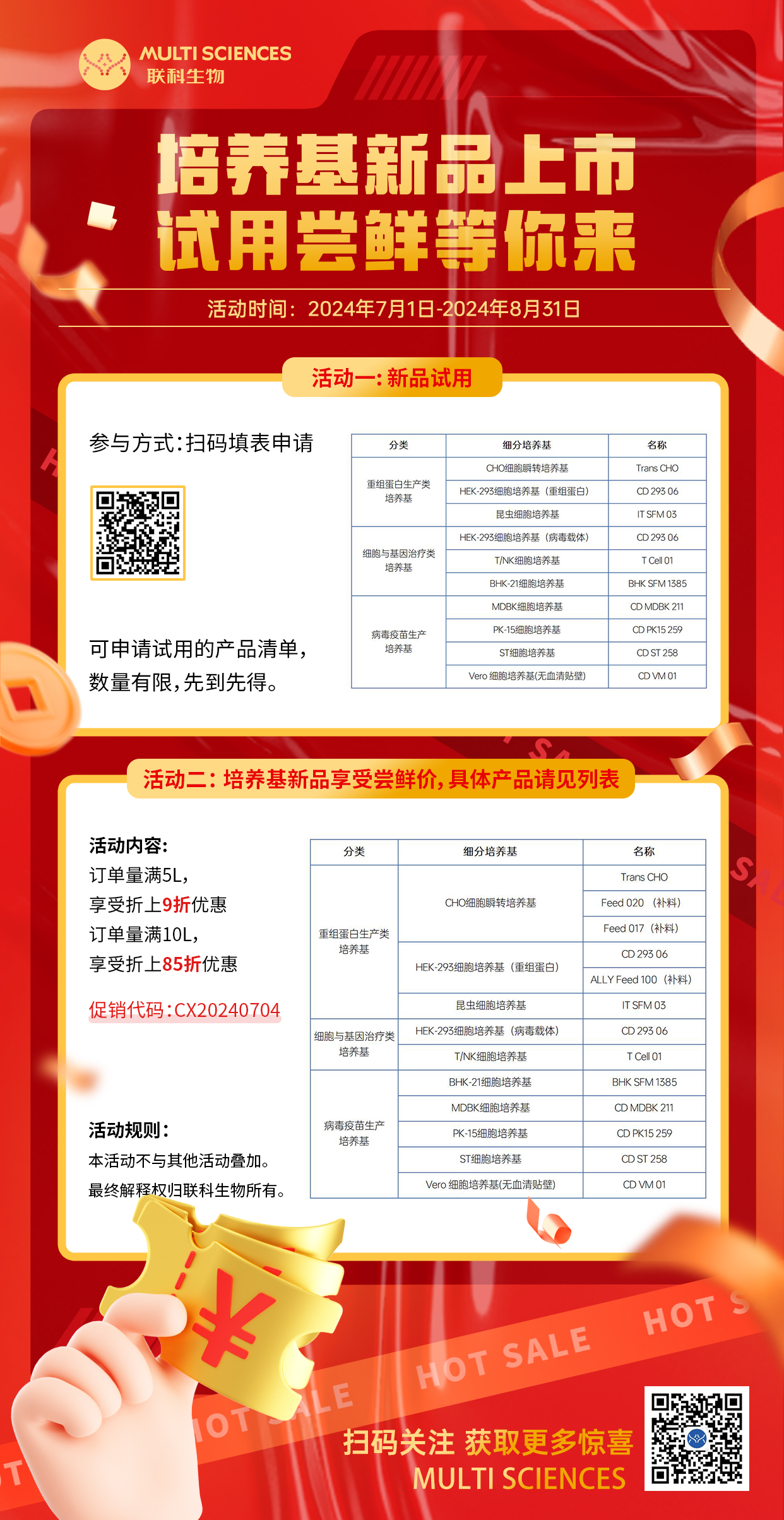 活动持续中!培养基新品尝鲜等您来!已结束 Post published:2024-07-01 Post category:促销Post views:2231 次访问 Read more articles Previous Post培养基新品上市,试用尝鲜等你来已结束 Next Post烈日炎夏,超值优惠欢乐购已结束 你可能也喜欢 培养基新品上市,试用尝鲜等你来已结束 2024-06-11 揭秘昆虫细胞培养:生物实验室的秘密武器 2024-11-27 R&D造血干细胞(HSC)培养基产品推荐 2016-06-02 开学学习计划,如何收集ELISA检测样本——细胞 2025-03-10 如何检测Th1/Th2细胞因子:样本处理 - 刺激染色 - 流式分析 - 结果示例 2021-08-24 会议邀请 | 联科生物邀您共赴2024 BPD第七届生物药工艺发展大会 2024-08-05 HEK293无血清培养基,细胞培养的好搭子 2024-11-05 为何要选择无血清培养基? 2024-09-23