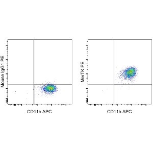 Human monocyte-derived macrophages cultured in the presence of Human M-CSF Recombinant Protein (cat. 14-8789) and dexamethazone were stained with Anti-Human CD11b APC (cat. 17-0118) and Mouse IgG1 K Isotype Control PE (cat. 12-4714) (left) or Anti-Human MerTK PE (right). Total viable cells, as determined by Fixable Viability Dye eFluor® 450 (cat. 65-0863), were used for analysis. |